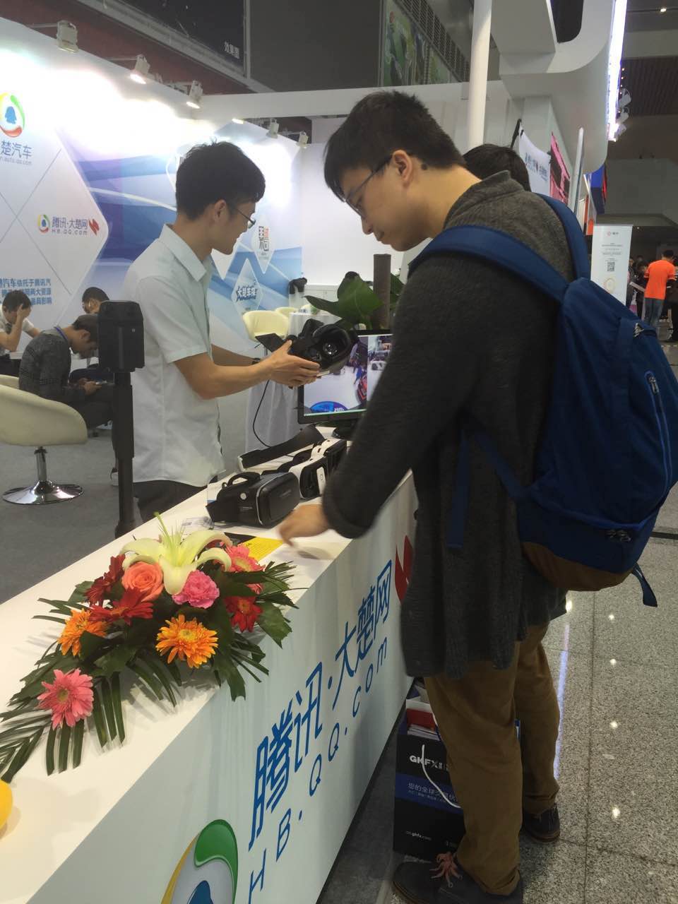 在5月27日至5月31日,第14届华中国际车展在武汉国际博览中心隆重开幕,全景高科VR团队联合腾讯大楚网汽车频道开设了VR全景看车展体验区,现场体验的用户络绎不绝。给此次车展带来了一大亮点。