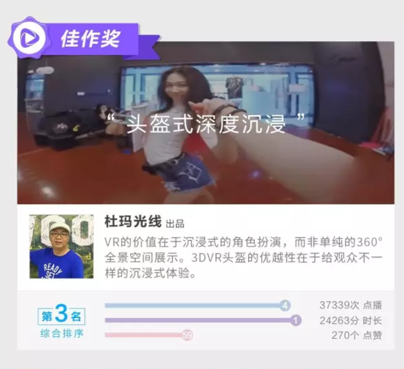 由国内首家泛VR娱乐聚合移动平台——3D播播主办的迅雷第二届全景视频大赛,已于6月25日结束全部赛程,本次大赛共设立5个奖项,以播放次数、播放时长、投票数三个维度综合评选,奖项全面覆盖来自各地的制作者及团队。经过紧张的数据统计阶段,近30部作品脱颖而出,现公布大赛获奖名单。